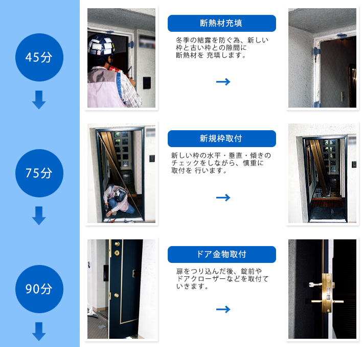玄関ドアリフォームは、従来よりハツリ工法やカバー工法を用いるのが一般的です。 しかし弊社はドア枠に特殊金具(*1)を使用することにより、現状ドアの開口面積を最大限(96.7%)に保ち、短時間工事を実現。 玄関ドアをリフォームすることにより、二重ロック(標準仕様)による安全性・防犯性の向上が得られます。 機能面では扉開閉の快適性・枠廻りへの断熱材充填による結露防止・エアタイトゴム採用による遮音性、気密性が得られます。また、どのような外壁や内装にも合うように、豊富なカラー ・デザイン ・バリエーションを揃え美観の面からもマンション等の財産としての価値の向上が得られます。