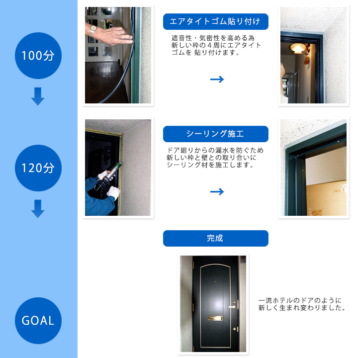 | 弊社工法 | 2~3時間 | 96.7% | 少 | 無 | ビス止め | 無(枠焼付塗装済) |